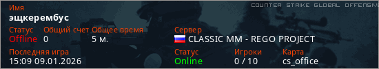 Играет на Counter Strike Global Offensive сервере. Страна: РоссияПервый раз замечен 14:52 09.01.2026