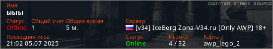 Играет на Counter Strike Source сервере. Страна: РоссияПервый раз замечен 21:00 05.07.2025