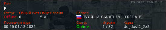 Играет на Counter Strike 1.6 сервере. Страна: РоссияПервый раз замечен 00:16 01.12.2025