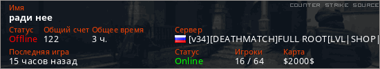 Играет на Counter Strike Source сервере. Страна: РоссияПервый раз замечен 20:37 18.05.2025