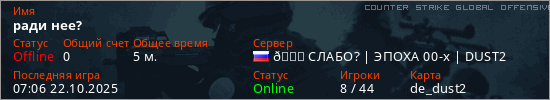 Играет на Counter Strike Global Offensive сервере. Страна: РоссияПервый раз замечен 07:01 22.10.2025