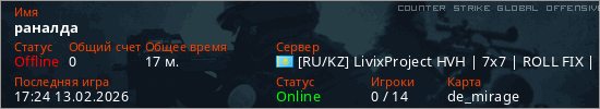 Играет на Counter Strike Global Offensive сервере. Страна: КазахстанПервый раз замечен 19:53 07.02.2026