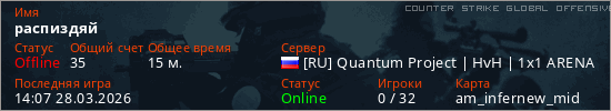 Играет на Counter Strike Global Offensive сервере. Страна: РоссияПервый раз замечен 17:11 23.03.2026