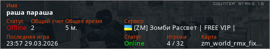 Играет на Counter Strike 1.6 сервере. Страна: УкраинаПервый раз замечен 19:46 29.03.2026
