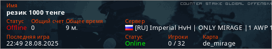 Играет на Counter Strike Global Offensive сервере. Страна: РоссияПервый раз замечен 17:59 25.08.2025