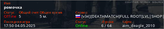 Играет на Counter Strike Source сервере. Страна: РоссияПервый раз замечен 17:40 04.05.2025