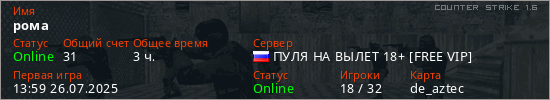 Играет на Counter Strike 1.6 сервере. Страна: РоссияПервый раз замечен 13:59 26.07.2025