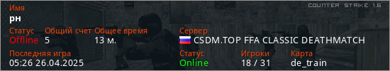 Играет на Counter Strike 1.6 сервере. Страна: РоссияПервый раз замечен 05:13 25.04.2025