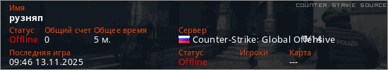 Играет на Counter Strike Source сервере. Страна: РоссияПервый раз замечен 09:29 13.11.2025