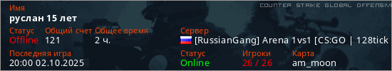 Играет на Counter Strike Global Offensive сервере. Страна: РоссияПервый раз замечен 15:38 25.06.2025