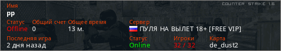 Играет на Counter Strike 1.6 сервере. Страна: РоссияПервый раз замечен 21:28 27.07.2025