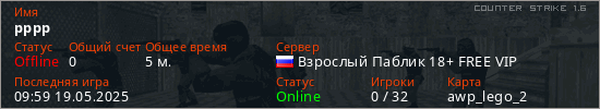 Играет на Counter Strike 1.6 сервере. Страна: РоссияПервый раз замечен 09:51 19.05.2025