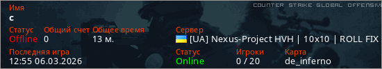 Играет на Counter Strike Global Offensive сервере. Страна: УкраинаПервый раз замечен 20:56 05.03.2026