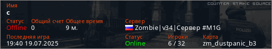 Играет на Counter Strike Source сервере. Страна: РоссияПервый раз замечен 17:15 19.07.2025