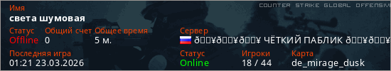 Играет на Counter Strike Global Offensive сервере. Страна: РоссияПервый раз замечен 00:52 23.03.2026