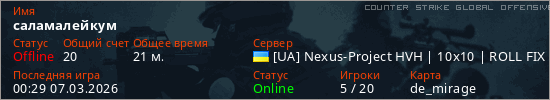 Играет на Counter Strike Global Offensive сервере. Страна: УкраинаПервый раз замечен 02:27 05.03.2026