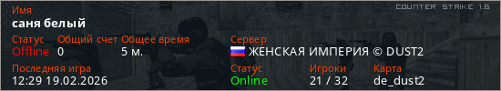 Играет на Counter Strike 1.6 сервере. Страна: РоссияПервый раз замечен 12:22 19.02.2026
