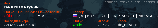Играет на Counter Strike Global Offensive сервере. Страна: РоссияПервый раз замечен 20:30 02.03.2026