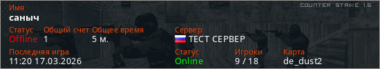 Играет на Counter Strike 1.6 сервере. Страна: РоссияПервый раз замечен 11:16 17.03.2026