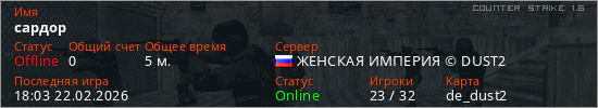 Играет на Counter Strike 1.6 сервере. Страна: РоссияПервый раз замечен 17:22 22.02.2026