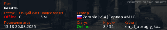 Играет на Counter Strike Source сервере. Страна: РоссияПервый раз замечен 13:12 20.08.2025