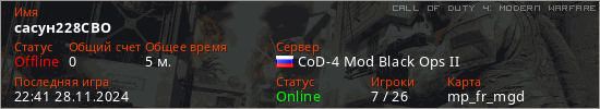 Играет на Call of Duty 4: Modern Warfare сервере. Страна: РоссияПервый раз замечен 22:39 28.11.2024
