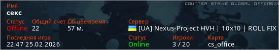 Играет на Counter Strike Global Offensive сервере. Страна: УкраинаПервый раз замечен 23:08 22.02.2026