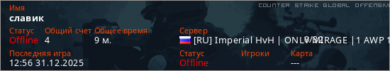 Играет на Counter Strike Global Offensive сервере. Страна: РоссияПервый раз замечен 11:44 31.12.2025