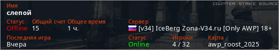 Играет на Counter Strike Source сервере. Страна: РоссияПервый раз замечен 18:54 06.02.2025