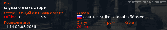 Играет на Counter Strike Source сервере. Страна: РоссияПервый раз замечен 10:55 05.03.2026