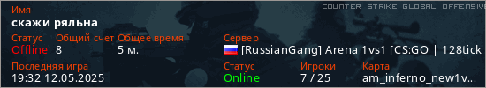 Играет на Counter Strike Global Offensive сервере. Страна: РоссияПервый раз замечен 19:28 12.05.2025