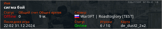Играет на Counter Strike 1.6 сервере. Страна: РоссияПервый раз замечен 16:00 31.12.2024
