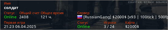 Играет на Counter Strike Source сервере. Страна: РоссияПервый раз замечен 21:23 06.04.2025