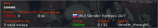 Играет на Team Fortress 2 сервере. Страна: РоссияПервый раз замечен 17:56 15.03.2026