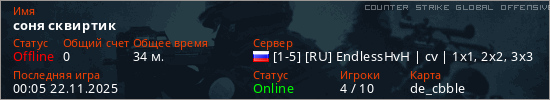 Играет на Counter Strike Global Offensive сервере. Страна: РоссияПервый раз замечен 14:08 16.11.2025