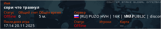 Играет на Counter Strike Global Offensive сервере. Страна: РоссияПервый раз замечен 17:12 20.11.2025