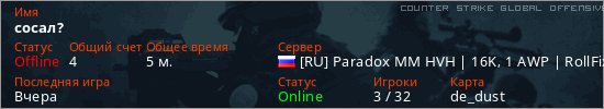 Играет на Counter Strike Global Offensive сервере. Страна: РоссияПервый раз замечен 12:25 30.01.2026