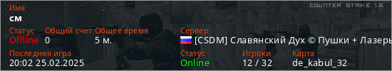 Играет на Counter Strike 1.6 сервере. Страна: РоссияПервый раз замечен 19:56 25.02.2025