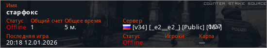 Играет на Counter Strike Source сервере. Страна: РоссияПервый раз замечен 20:01 12.01.2026