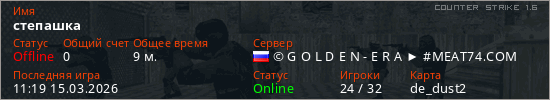 Играет на Counter Strike 1.6 сервере. Страна: РоссияПервый раз замечен 06:45 15.03.2026