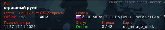 Играет на Counter Strike Global Offensive сервере. Страна: РоссияПервый раз замечен 18:54 07.11.2024
