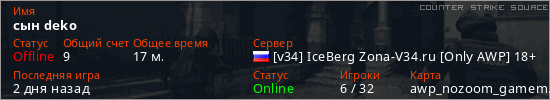 Играет на Counter Strike Source сервере. Страна: РоссияПервый раз замечен 11:54 24.02.2026