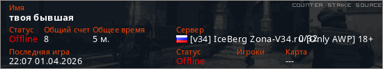 Играет на Counter Strike Source сервере. Страна: РоссияПервый раз замечен 22:05 01.04.2026
