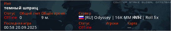 Играет на Counter Strike Global Offensive сервере. Страна: РоссияПервый раз замечен 16:53 16.09.2025