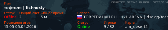 Играет на Counter Strike Global Offensive сервере. Страна: РоссияПервый раз замечен 14:53 05.04.2026
