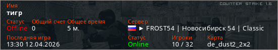 Играет на Counter Strike 1.6 сервере. Страна: РоссияПервый раз замечен 13:26 12.04.2026