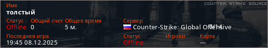 Играет на Counter Strike Source сервере. Страна: РоссияПервый раз замечен 19:41 08.12.2025