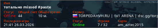 Играет на Counter Strike Global Offensive сервере. Страна: РоссияПервый раз замечен 21:13 26.03.2026