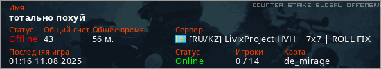 Играет на Counter Strike Global Offensive сервере. Страна: КазахстанПервый раз замечен 17:26 10.08.2025