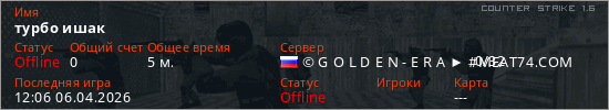 Играет на Counter Strike 1.6 сервере. Страна: РоссияПервый раз замечен 11:58 06.04.2026